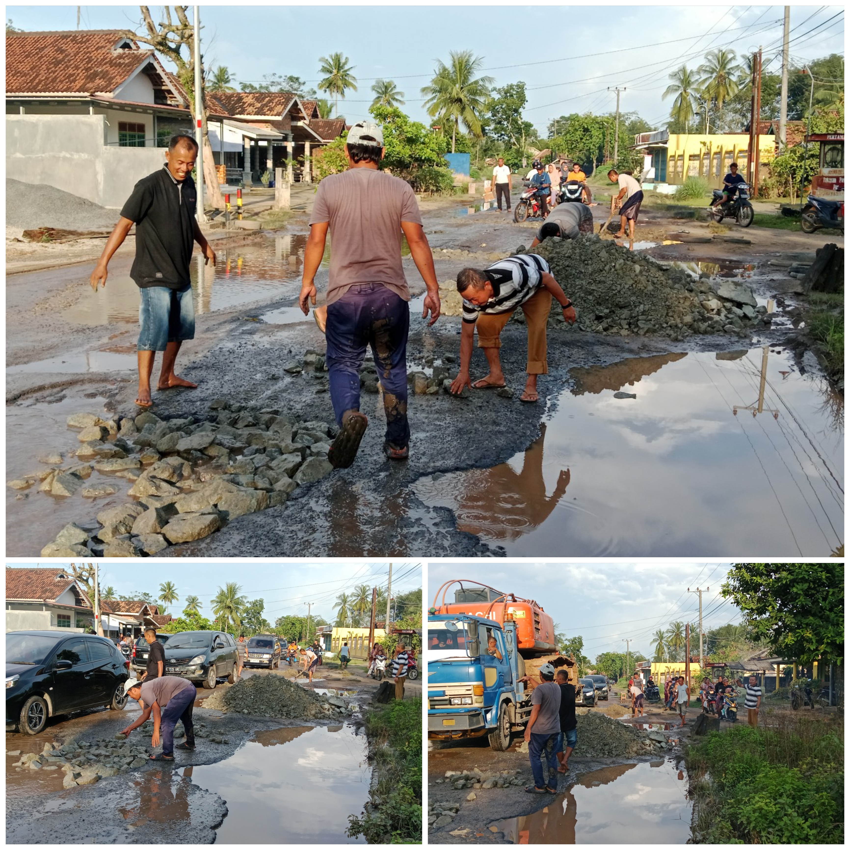 Saikuddin kepalo tiyuh penumangan bersama masyarakat dan perangkat desa lainnya bergotong royong memperbaiki jalan lintas provinsi yang rusak parah seperti kolam renang senin 16/3/26